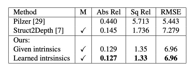 表1:总结了在KITTI上训练的模型和评估结果,使用给定相机内建和学习相机内建两种方式来评估我们方法的深度估计,结果显而易见,我们获得了当前最佳SOTA。