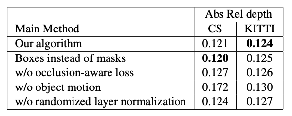 表3:深度估计的消融实验。在所有实验中,训练集是Cityscapes(CS)和KITTI组合,我们分别在Cityscapes(CS)和KITTI(Eigen partition)上测试模型。每行代表一个实验,其中与主方法相比进行了一次更改,如“实验”行中所述。数字越小越好。