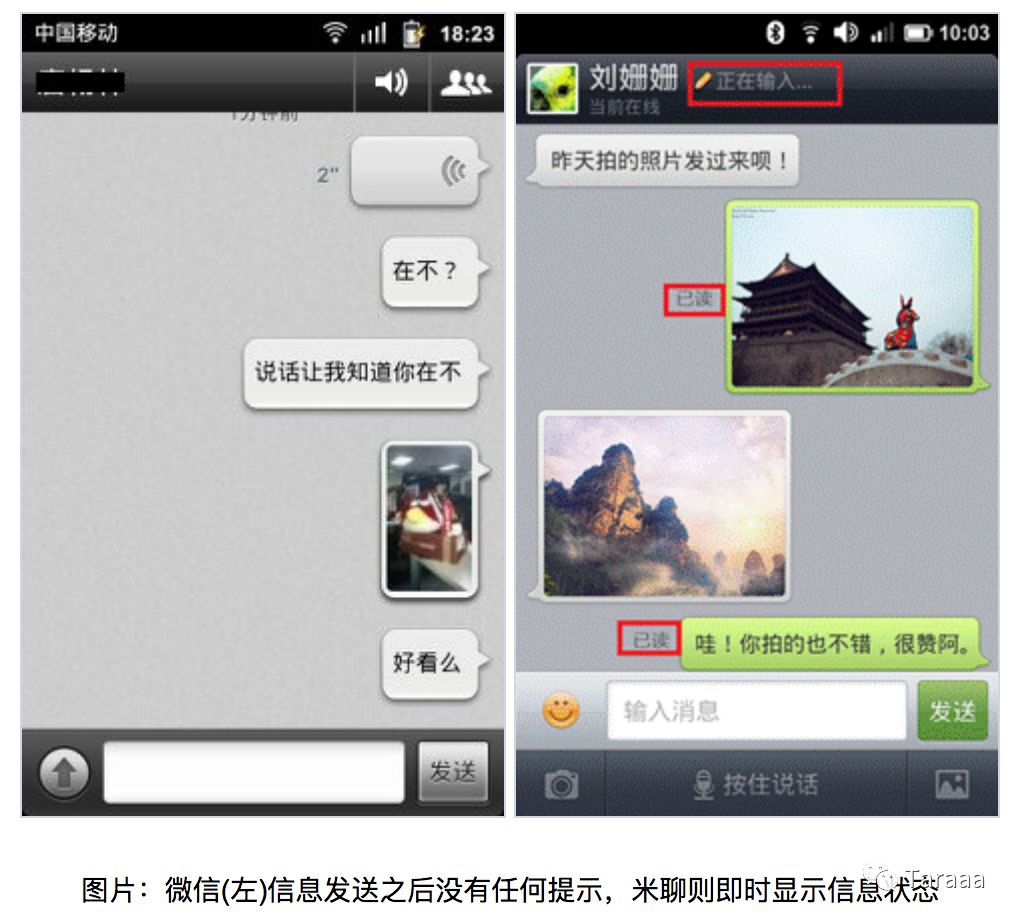 米聊在信息状态这一细节处理上非常的用心:显示对方的输入状态、即时显示信息发送之后的状态,比如送达、已读、已听、发出、待发等,每一个提示代表信息的不同状态,让我们清晰可见,非常之贴心。相对比之下,微信则没有任何提示。