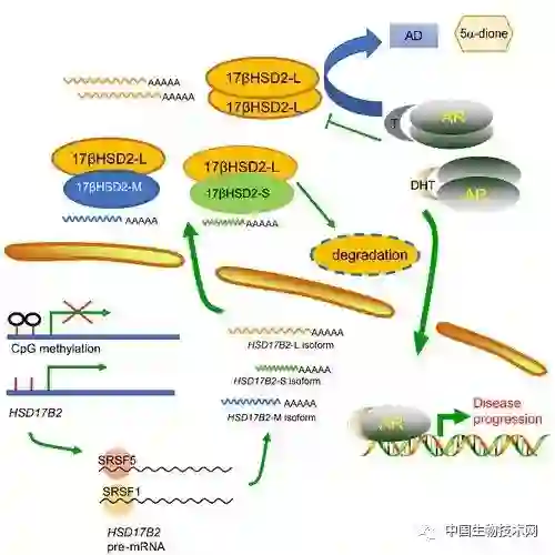 图:DNA甲基化,雄激素应激和mRNA的可变剪接都可使HSD17B2功能性沉默。