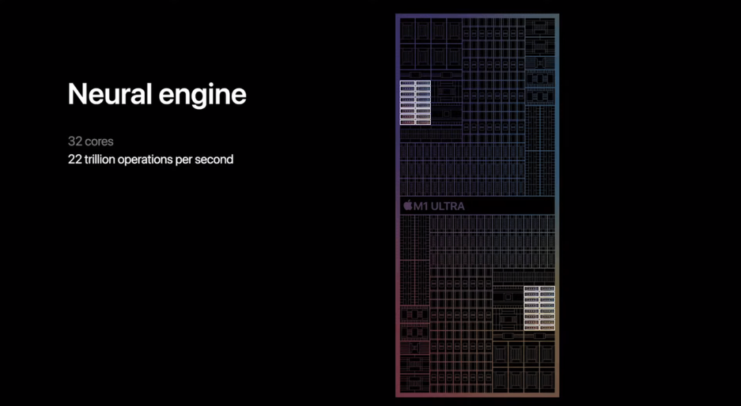 M1 Ultra 具有 32 核神经网络引擎,每秒运行高达 22 万亿次运算,可以加速完成最具挑战性的机器学习任务。