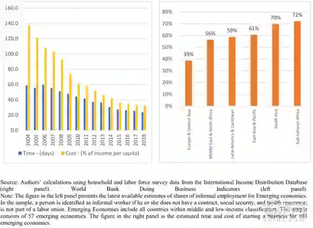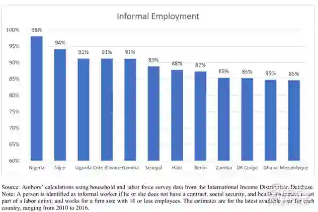 过去二十年,在发展中经济体中,非正式的情况没有大幅度减少。尽管商业环境在优化,但有些地区的非正式工作依然存在,部分发展中经济体的比例甚至达到了90%(赞比亚和马达加斯加等国家的非正式工作情况约占80%),新兴经济体的比例也有55%。