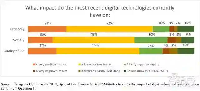 根据欧盟2017年3月的一项调研显示:74%的受访者认为技术将有利于就业,64%的人认为技术将促进社会发展,67%的人认为技术将改善生活品质。