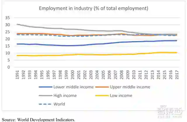 高收入国家,比如新加披、西班牙、葡萄牙,制造业就业率确实比1991年下跌了10%多,但相应的,服务业就业率在上升。低收入国家,则从1991年开始(到2017年),制造业在劳动力就业中的比重就一直在10%稳定,中上等收入国家这一比重维持在23%左右,中下等收入国家的这一比重(由于贸易开放和收入/需求增加)则经历了16.4%到18.8%的提升。