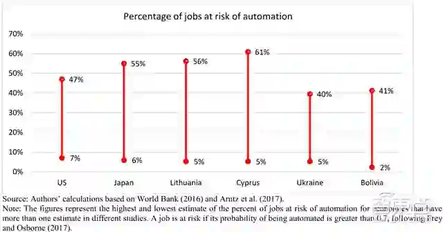 ▲各国自动化可能对就业带来冲击的情况预估