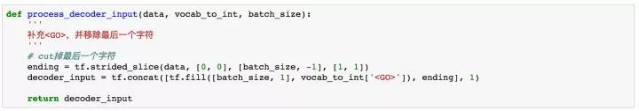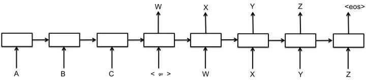 我们此时只看右边的Decoder端,可以看到我们的target序列是[<go>, W, X, Y, Z, <eos>],其中<go>,W,X,Y,Z是每个时间序列上输入给RNN的内容,我们发现,<eos>并没有作为输入传递给RNN。因此我们需要将target中的最后一个字符去掉,同时还需要在前面添加<go>标识,告诉模型这代表一个句子的开始。