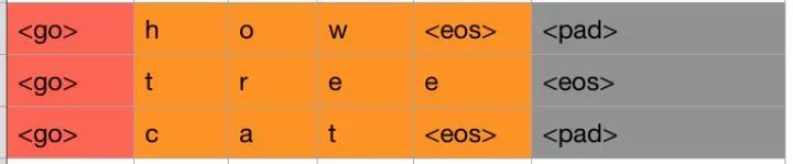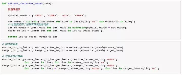 在神经网络中,对于文本的数据预处理无非是将文本转化为模型可理解的数字,这里都比较熟悉,不作过多解释。但在这里我们需要加入以下四种字符,<PAD>主要用来进行字符补全,<EOS>和<GO>都是用在Decoder端的序列中,告诉解码器句子的起始与结束,<UNK>则用来替代一些未出现过的词或者低频词。