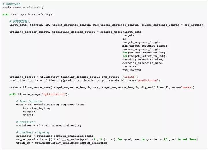 # 超参数 # Number of Epochs epochs = 60 # Batch Size batch_size = 128 # RNN Size rnn_size = 50 # Number of Layers num_layers = 2 # Embedding Size encoding_embedding_size = 15 decoding_embedding_size = 15 # Learning Rate learning_rate = 0.001