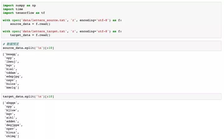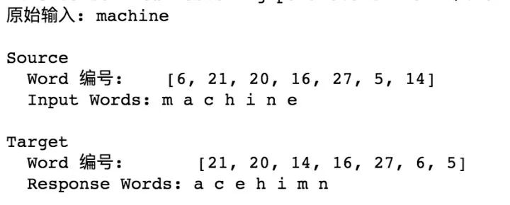 - target_data: 每一行是经过字母排序后的“单词”,它的每一行与source_data中每一行一一对应