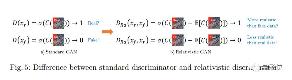 SRGAN的判别器,仅仅针对输入图x判断真实且自然的概率,而相对判别器尝试去预测真实图像xr相对于生成结果(假的)xf更加真实地概率。