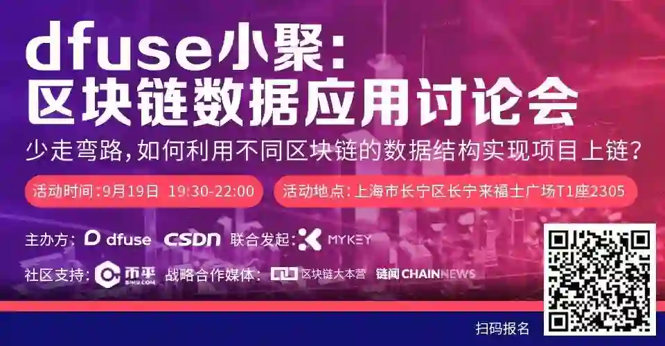 9月19日,【dfuse小聚:区块链数据应用讨论会】将在上海举行,dfuse CTO&联合创始人、EOS加拿大联合创始人 Alex Bourget;慢雾科技合伙人兼安全产品负责人启富(Keywolf);MYKET联合创始人/EOS Cannon联合创始人Ricky胖哥,与你一起深度探索区块链应用搭建以及区块链数据结构的奥秘,让你明白到底你的业务该如何上链!长按下方二维码报名: