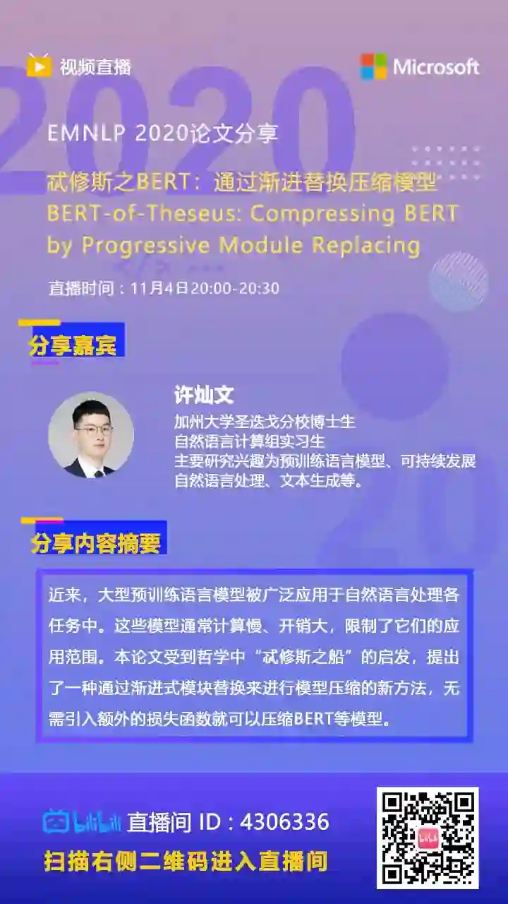 明天(11月4日)20:00-20:30,加州大学圣迭戈分校博士生、微软亚洲研究院自然语言计算组实习生许灿文将在 B 站分享 EMNLP 2020 论文 “忒修斯之 BERT:通过渐进替换压缩模型”。