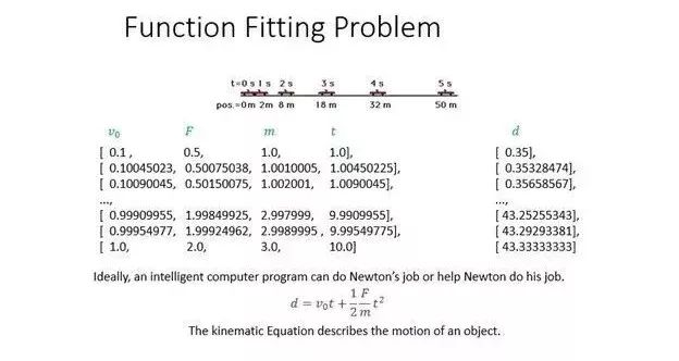 理想情况下,一个智能的计算机程序可以像牛顿一样经过数据分析直接得到如下的数学公式: