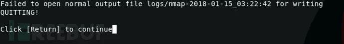 第二个坑,nmap自动生成的日志文件nmap-2018-01-15_03:19:31不能写入,初步判断应该是没有logs目录,果断在当前目录下创建个logs文件夹(mkdir logs)。