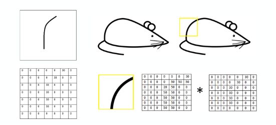 接下来再想象一下我们有老鼠耳朵卷积核、老鼠眼睛卷积核、老鼠胡须卷积核、老鼠尾巴卷积核等一大堆卷积核,分别用这些卷积核扫描图片,如果卷积运算的结果都超过了阈值,就可以说这副图片具备老鼠的各种特征,即这副图片的内容在很大的可能性上是一只老鼠。