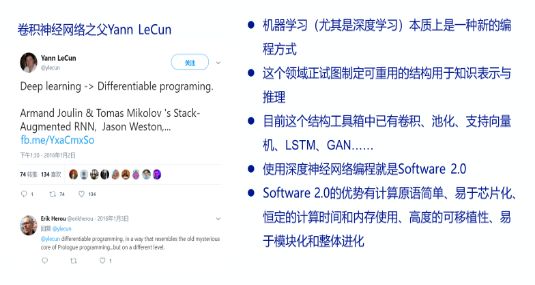 卷积神经网络之父Yann LeCun说这是一种全新的编程方式,叫Differentiable Programming。Differentiable Programming和声明式编程有些相似之处:你只需准备好输入数据和期望的输出数据作为训练数据,神经网络就会自动构造出中间的过程。更有意思的是,训练好的机器学习模型是可以芯片化的,相比于通用型的CPU,这种芯片可以大大降低晶体管数量和能耗,并提高运行效率。