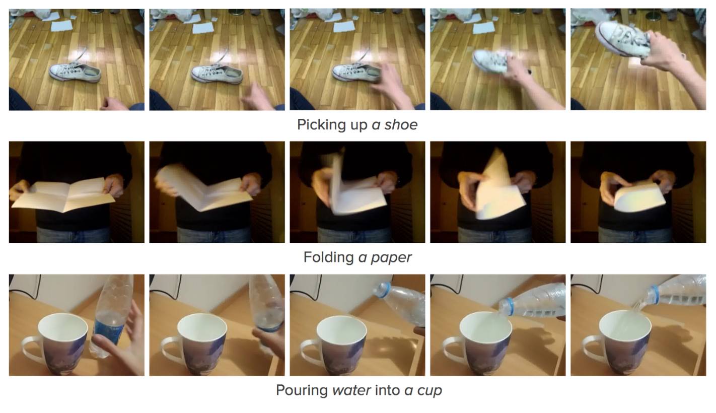 此数据集的目的不仅仅是在视频中检测和追踪物体,而且还是为了破译人类行为者(human actors)的表现和那些直接或间接地操作物体的动作。根据视频来预测文本标注往往需要强视觉特征(strong visual features),这些特征能够表征物体和这个世界中的大量物理特性。这就包括那些属性的相关信息,比如空间关系和材料属性。