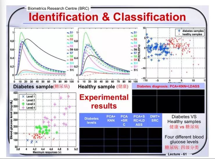 第二个是嗅觉感知,指的是口腔气味,我们可以借此判断潜在的病理信息。我们创建了可以捕捉人体内部气味的传感器阵列,最终发现不同的类型的疾病会得到不同类型的波形。通过我们的研究,我们认为糖尿病与血检、呼吸等皆有一定关联,于是我们进一步探讨糖尿病的无损检测研究,对于是否患上糖尿病以及糖尿病等级都做了相应探讨。