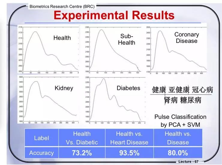 第三个是触觉感知,我们按照中医的三部九侯思路设计了相应系统。鉴于脉象是血流通过内脏器官流到人的末梢,带有内脏器官的病理信息,因此我们一直坚定脉象无法被ECG取代。我们通过生物特征识别技术对大量特征进行提取,然后进行优化,最终形成了对不同波形的分析。