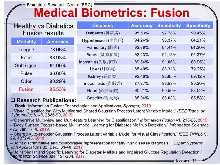 – “DetectingDiabetesMellitusandNonproliferativeDiabeticRetinopathyUsing Tongue Color, Texture, and Geometry Features”, IEEE Trans. on Biom. Eng. 2, 61, 491-501, 2014. (舌像应用)