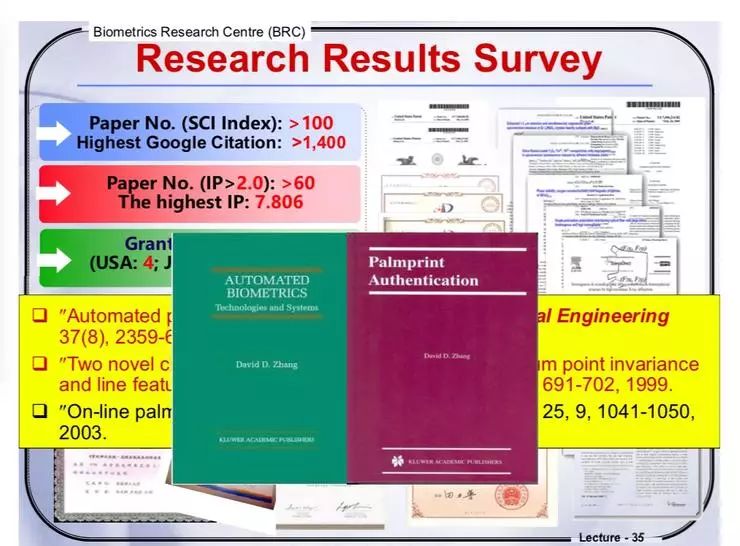 掌纹识别研究发展至今,我们有很多文章被发表,同时也获得了诸多奖项的肯定。比如,我们在 1998 年首次在国际上发表的掌纹识别文章,还出过掌纹识别的总结性书籍。国际上相关的 13篇文章中,我们占了其中 2 篇。这也是我国研发的首套掌纹系统。