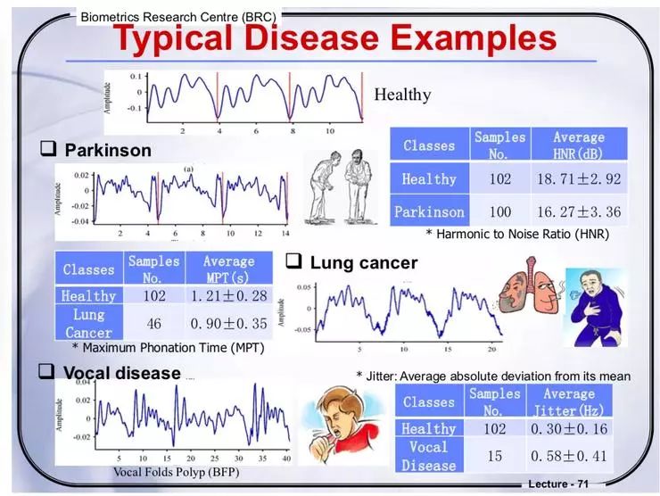 最后一个是听觉感知。我们希望通过我们的技术,可以找到对话中隐含的病理信息,因此我们系统探讨了它与发音、疾病之间的关系。这个工作相应来说进行得较晚,直到17年才有第一篇论文,而这几年也陆续有文章发表。