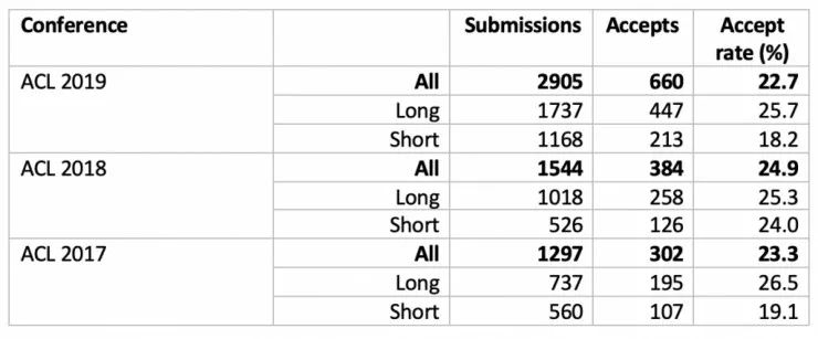 鉴于提交的论文数量创下了新纪录,ACL 2019 的评选过程竞争非常激烈。在提交的 2906 篇论文中(包括撤回论文 120 篇及被拒论文 92 篇,最终有效投稿 2694 篇),最终有 660 篇论文被本次会议收录,总体接收率为 22.7%。该接收率比 ACL 2018(24.9%)和 ACL 2017(23.3%)的接收率略低,但考虑到 ACL 2019 比 ACL 2018 有效投稿论文数量增加了 75%,因而严格来说,这两年的论文接收率是非常接近的。同时,在 660 篇接收论文中,有 447 篇长论文和 213 篇短论文。与往年一样,长论文的接收率明显更高(25.7% VS 18.2%),再次表明相比长论文而言,短论文更难被接收。具体如下: