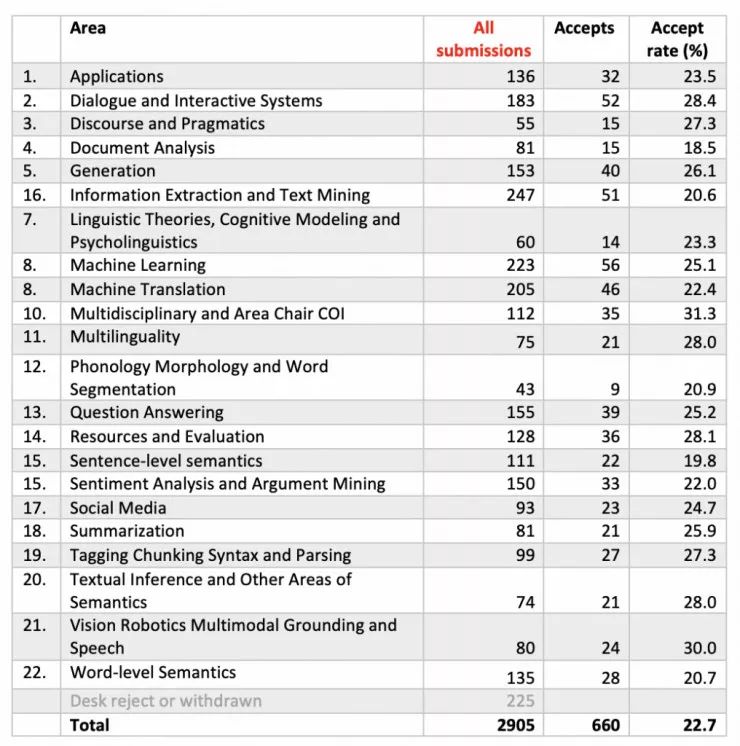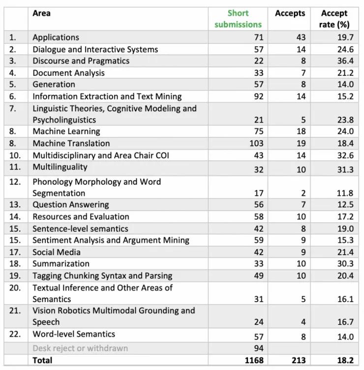 从第一个表中可以看出,被接收最有难度的领域是文档分析(18.5%)和句子级语义(19.8%),以及信息提取和文本挖掘(20.6%)、单词级语义(20.7%)和音系学、形态学和单词分割 (20.9%)。