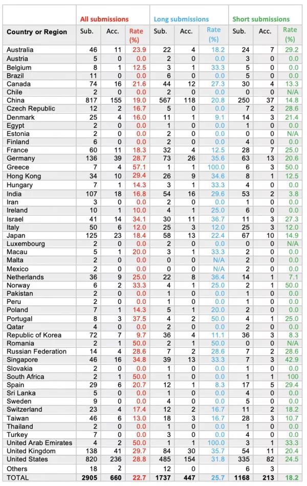 长论文接受率高于短论文,接受率最高的国家是新加坡。
