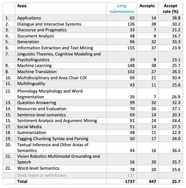 我们可以观察到,今年收录论文涵盖的 22 个主题领域的接收率存在一些有趣的差异。下面三个表显示了每个论文主题领域的统计数据(包括提交和被接收的论文数量,以及接收率)。第一个表显示了各个领域的所有论文数量,下面两个表则分别显示了各领域对应收录的长论文和短论文数量。