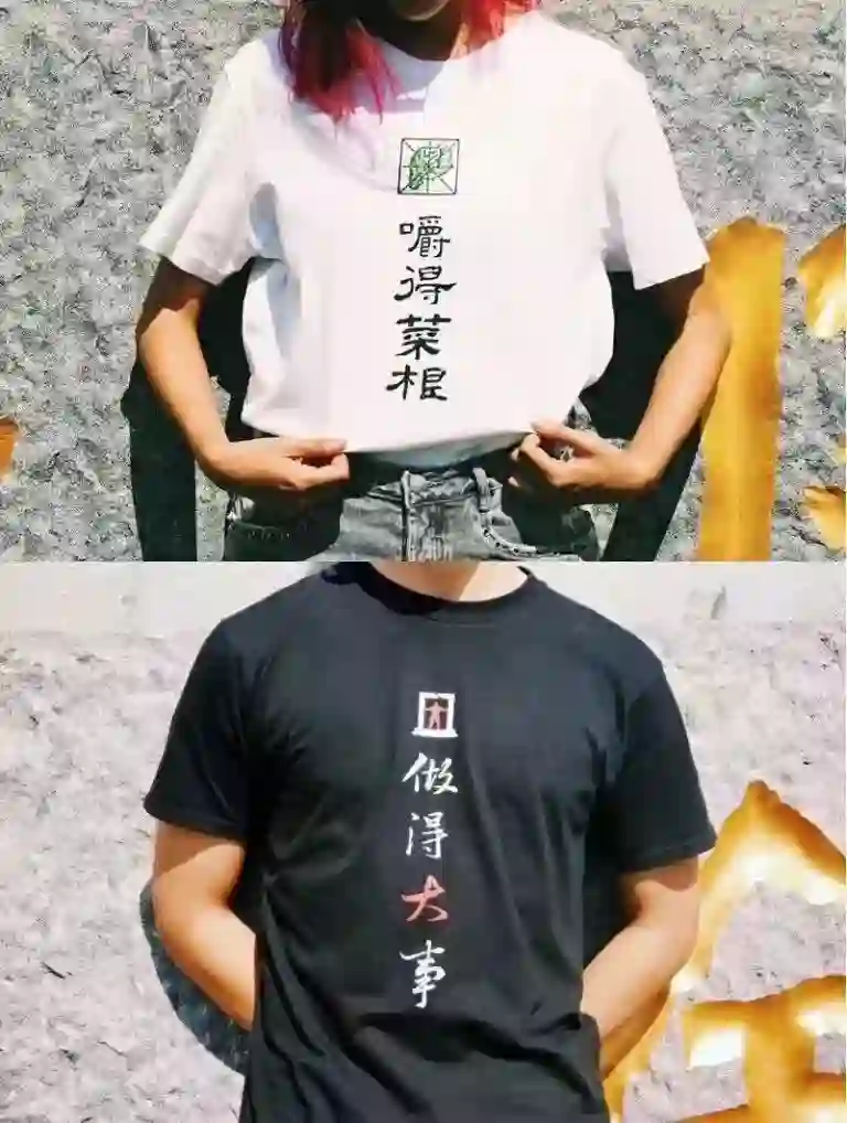 “设计文化衫前有去找历代著名书法家的字摘出来,再拼在一起。”