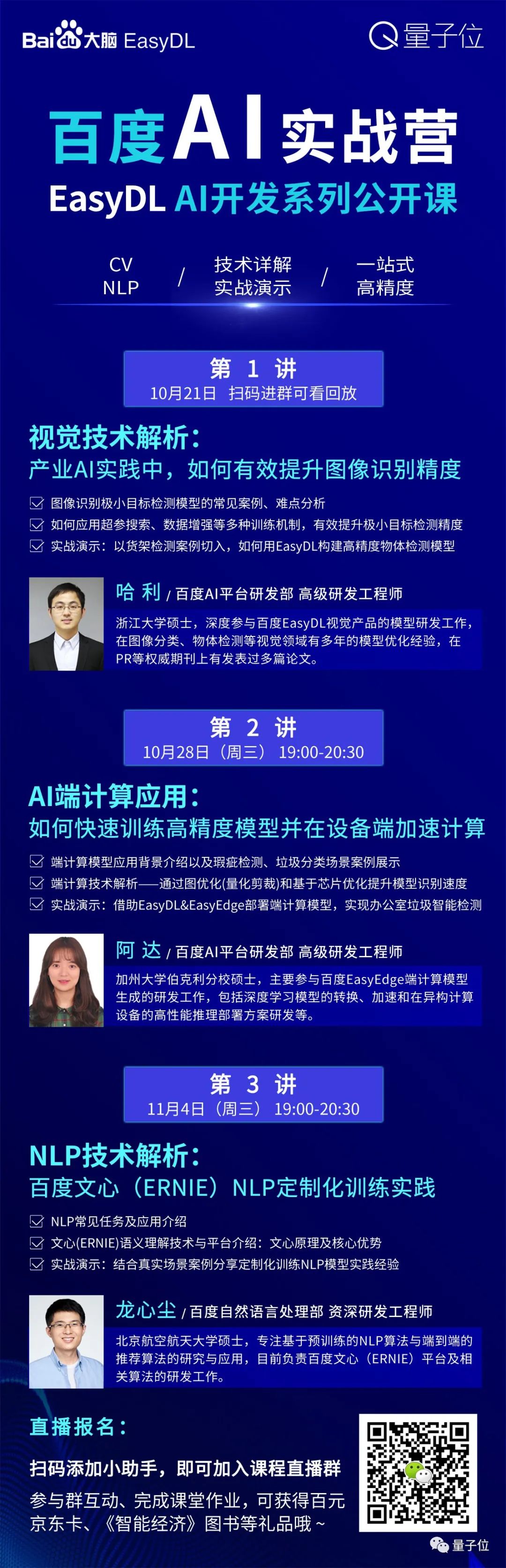 10.28日起,百度高级工程师带你轻松学AI开发、实现AI模型训练与部署!扫码添加量子位小助手(qbitbot12)、加入课程直播群吧~▽