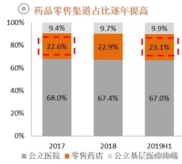 终端数据符合这一趋势,近两年里药品在公立医院渠道的销售占比从68%下降到67%,零售药店渠道的销售占比从22.6%上升到23.1%。通过我们草根调研国内大型连锁药店,其处方药占比每年上升约2个百分点左右。