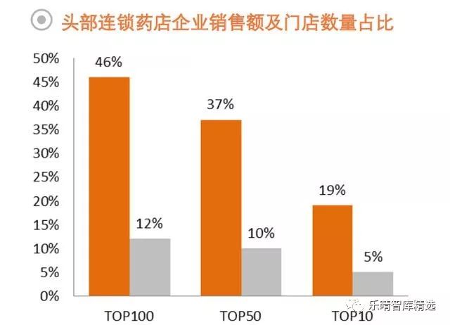 2017年,我国TOP100连锁药店企业的门店数量占比为12%,其收入占比达到46%。TOP10连锁药店企业的门店数量占比为5%,其收入占比为19%。说明头部企业的平均单店规模更大。行业集中度持续提高。