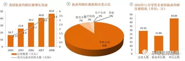 我国注册执业药师中,注册在零售企业的药师占比为90%,是执业药师最主要的注册单位。据2016年11月份的数据,我国零售药店的执业药师配备率仅为51%,约一半的药店无执业药师。