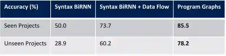 在量更大的定量评估中,这种新方法比传统的机器学习技术要好得多。作为基准测试方法,它考虑到了直接在源代码上工作的双向递归神经网络(BiRNN)以及访问数据流信息的 BiRNN 的简单扩展。为了评估不同的模型,他们分析了总共包含 290 万行源代码的开源 C#项目。在不同的机器学习模型中使用其中单个变量被删除并被要求预测最初使用的变量(假设代码经过充分测试且总是正确的)的源代码进行测试。在第一个实验中,他们用已保存的文件对这些模型进行训练。在第二个实验中,使用全新项目的数据测试这些模型。结果如下表所示,使用新的程序图测试结果更好。image