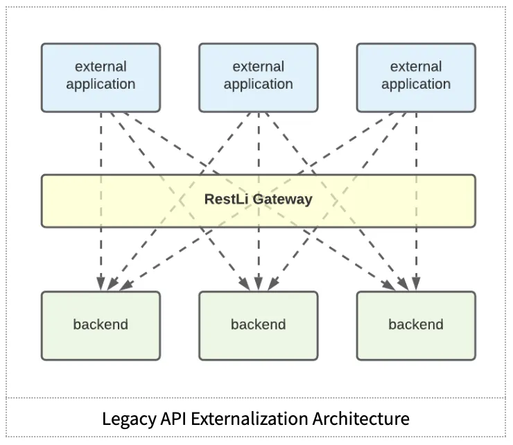 遗留的架构由各种业务线构建的后端 API 组成,并通过 Rest.liAPI 网关对外公开。由于这些 API 没有版本控制,所有为内部 API 实现的东西都会直接暴露给外部用户。