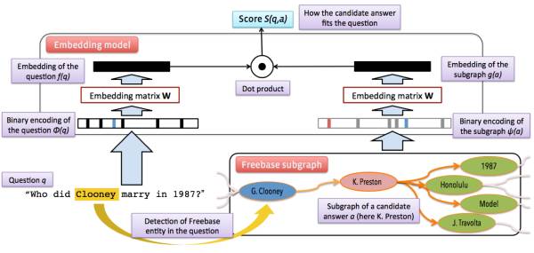此时,你的心中可能会出现两个问题,一是如何将问题和答案映射到低维空间,显然我们不能仅仅将自然语言的问题和答案进行映射,还要将知识库里的知识也映射到这个低维空间中(否则我们就只是在做QA而非KB-QA了)。第二个问题是,如果做过类似工作(one-shot,imgae caption,word embedding等)的朋友应该知道,使用这种方法是需要大量数据去训练这个低维空间的分布式表达的,而KB-QA中的benchmark数据集WebQuestion只含有5800多个问题答案对,这样的数据是难以训练好这种表达的。