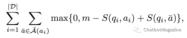 中的一个负样本(错误答案),m是一个值为0.1的margin。最小化这个损失函数,意味着我们希望正确答案和问题的得分要比任意错误答案的得分高出一个margin。
