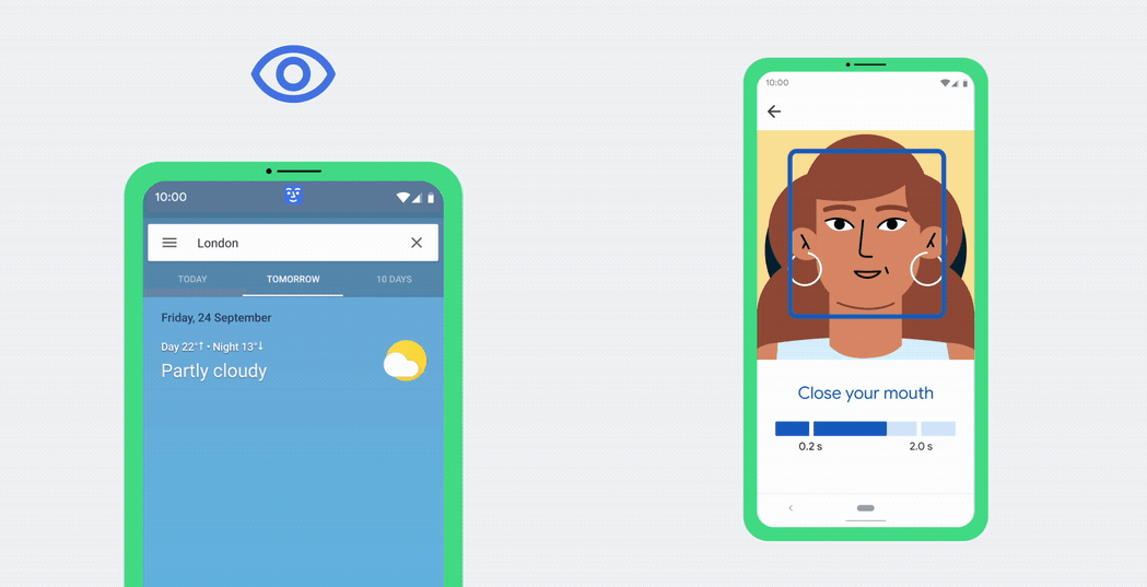 受运动和语言障碍人士启发,谷歌推出了 Camera Switches、Project Activate 应用,前者可以将前置摄像头变成开关,替代键鼠或者触摸屏等,后者可以使用面部表情和眼球运动来出发预设的动作,例如说出短语、播放音频、发送短信等。