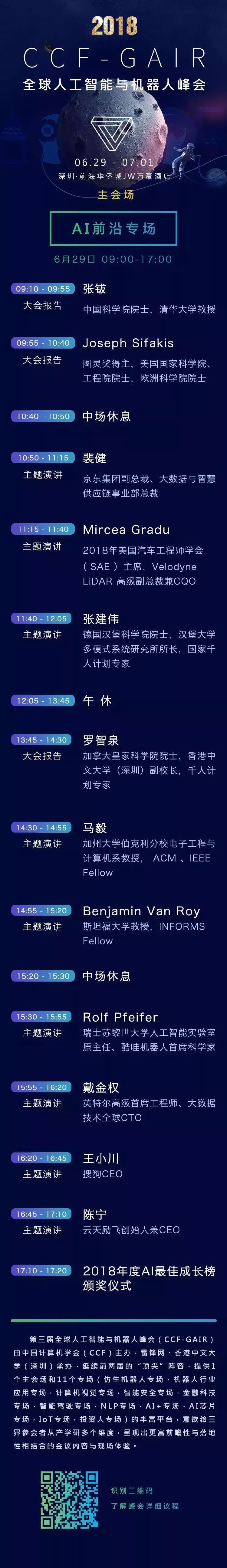 CCF-GAIR 2018 延续前两届的“顶尖”阵容,提供1个主会场和11个专场(仿生机器人专场,机器人行业应用专场,计算机视觉专场,智能安全专场,金融科技专场,智能驾驶专场,NLP专场,AI+专场,AI芯片专场,IoT专场,投资人专场)的丰富平台,意欲给三界参会者从产学研多个维度,呈现出更富前瞻性与落地性相结合的会议内容与现场体验。