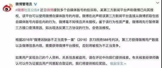 今年8月10号,微博官方公告,称某第三方新闻平台在微博毫不知情、并未授权的情况下直接从微博抓取自媒体账号的内容,鉴于其行为性质严重,微博先行暂停了第三方接口,并表示将会依法维权。