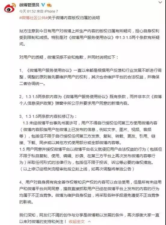 此后,新浪微博再次发布声明,称:微博上发布的原创内容,著作权理所应当属于内容创作者所有,微博作为发布平台只享有一定范围的使用权。用户对自己的原创内容,可以根据自己的意愿发布到其他平台上。
