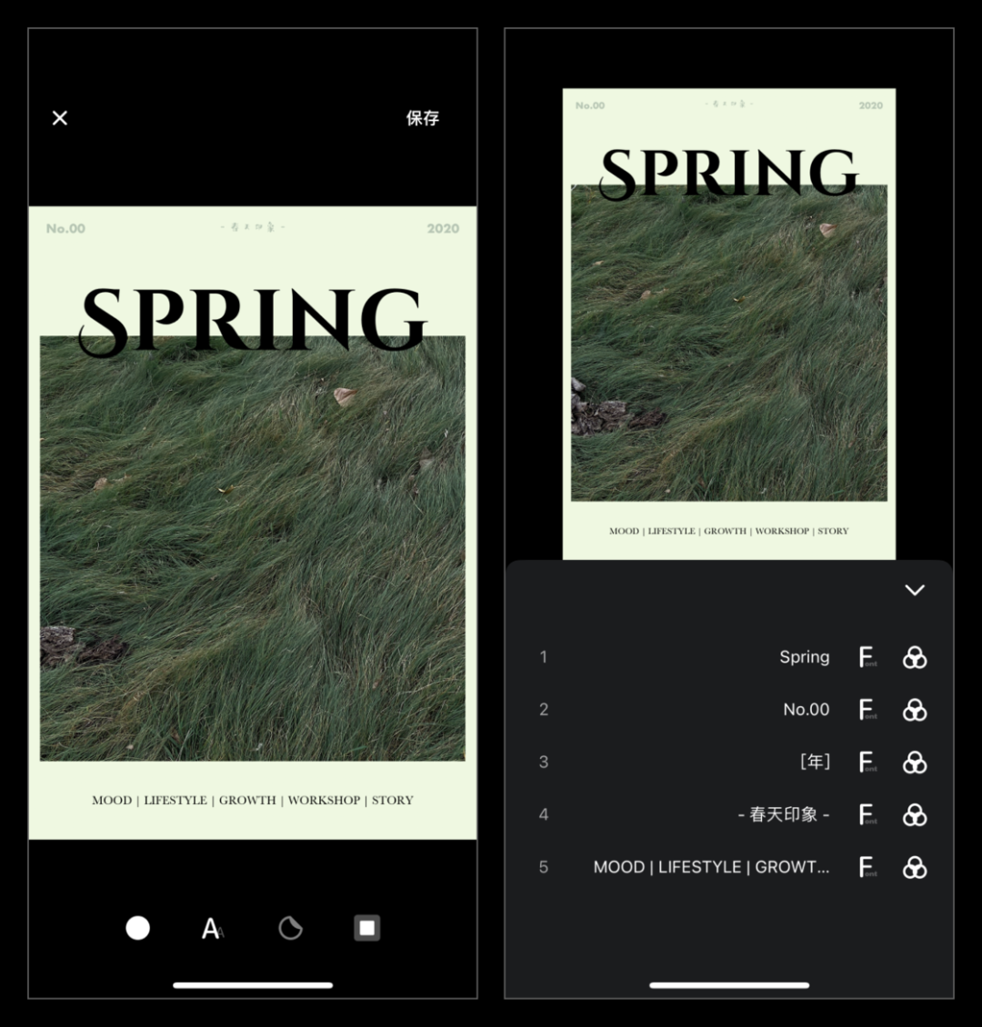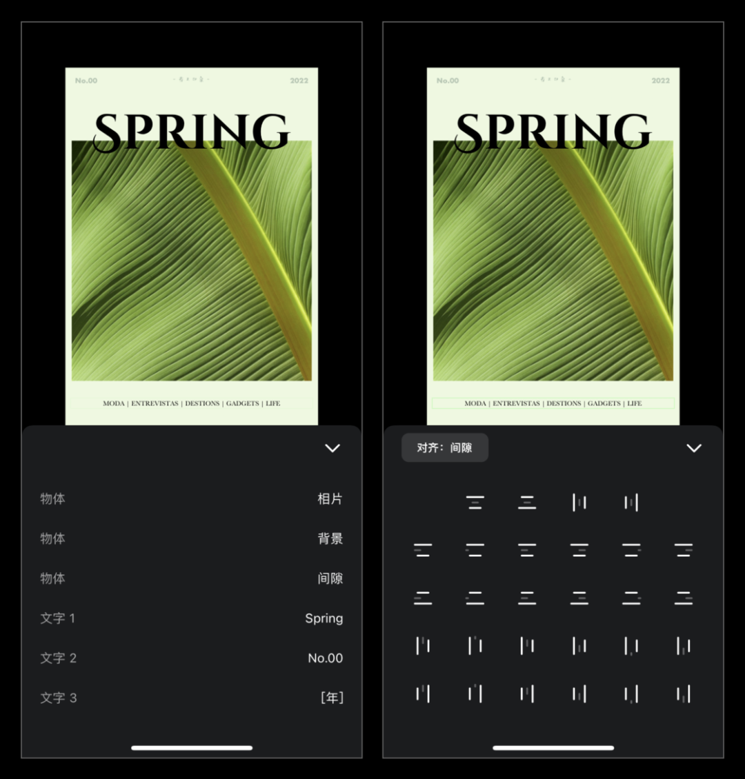 在创作室里,比较特别的是文字对齐功能。在这里,文字的布局没有采用简单的拖拽方案来完成,而是设计了一个相对复杂的对齐方案,用户可以选择各种情况的对齐对象与方法,随后再设计间距等参数。