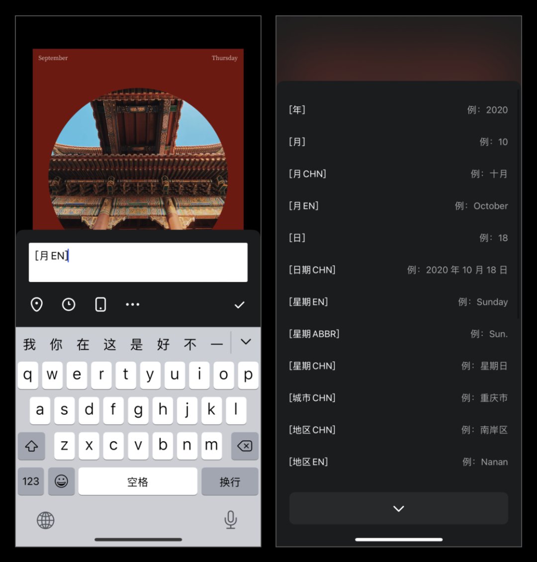 在介绍信息分类卡片时,我有提到一个叫「文字替换」的功能。这个功能的设计初衷也是为了更轻松快速地生成卡片。当前预设的文字替换覆盖了相片相关的常用文字内容,在后续,卡片馆还会上线自定义文字替换功能。