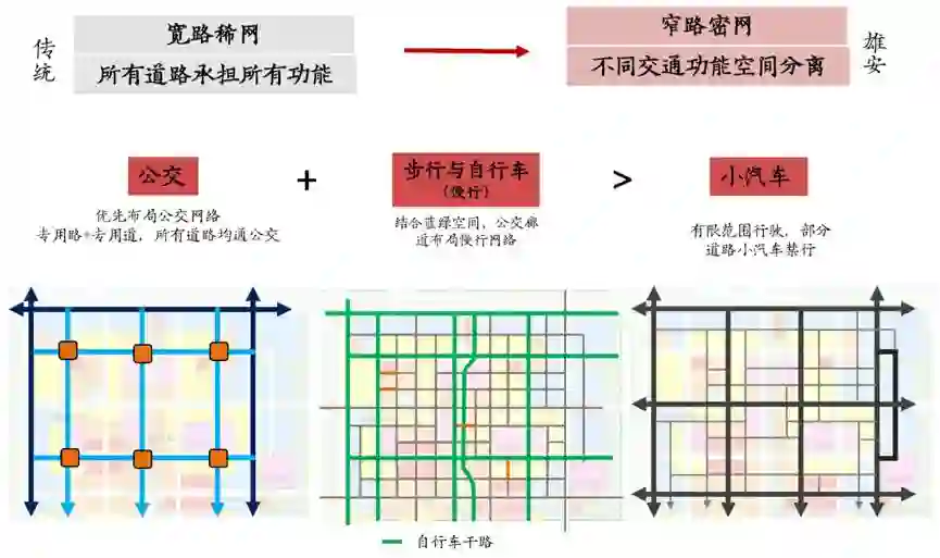 在交通组织上,坚持公交慢性导向,创新管控理念,通过不同交通功能的空间分离,挖掘窄路密网潜力。如,优先布局公交网络,通过设立专用路+专用道,所有道路都通公交;结合蓝绿空间、公交廊道设计慢性路网;而小汽车在有限范围行使,部分道路禁行。