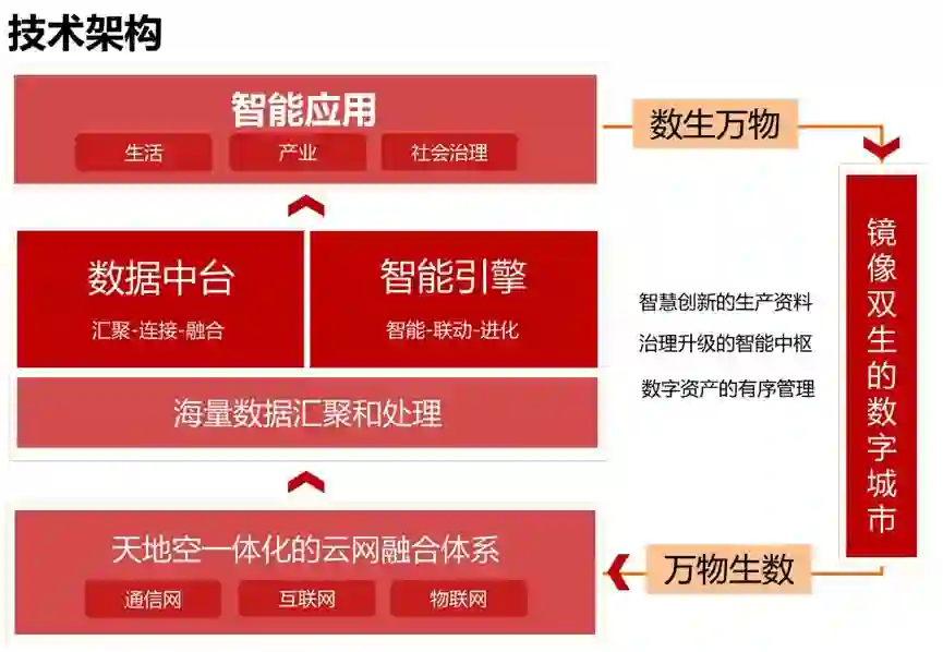 这是雄安镜像双生的数字城市技术架构。通过天地空一体化的云网融合体系,汇聚海量数据并进行处理,在数据中台连接、融合,借助智能引擎联动、进化,智能化应用于生产、生活、社会治理各领域。