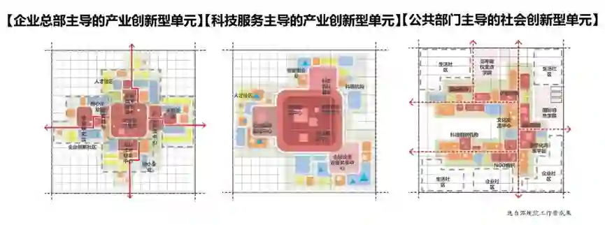不同的创新创业群体,其行为特征和空间组织模式也有差异。根据承接对象,分类组织创新型社区,如高等院校主导的科学发现型单元,科研机构主导的科技创新型单元,企业总部主导的产业创新型单元,科技服务主导的创新型单元,公共部门主导的社会创新型单元。