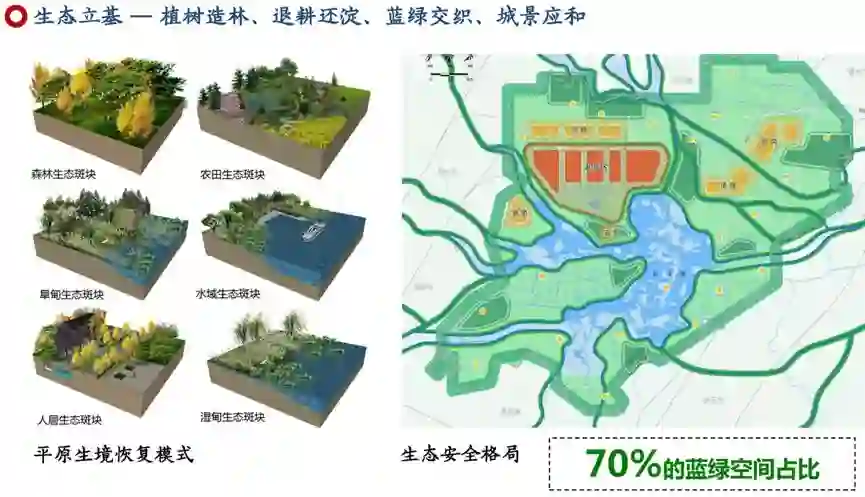 雄安新区蓝绿空间占比70%,为这种探索提供了广阔舞台。目前正在展开平原生境恢复,植树造林,退耕还淀,未来要构建蓝绿交织、城景应和的画面。