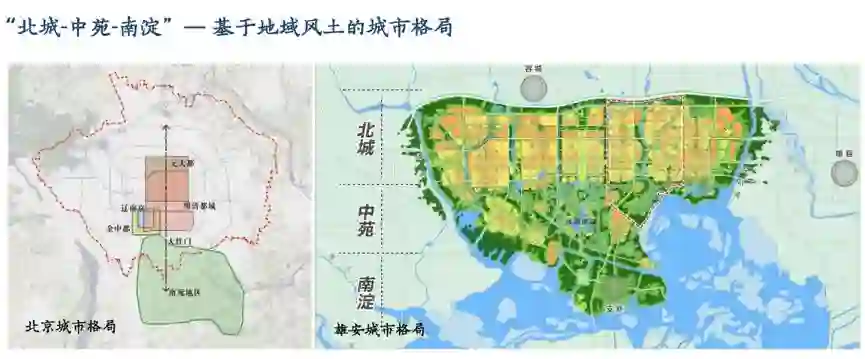 主城区“北城-中苑-南淀”的格局,既基于地域风土,也借鉴前人智慧。北城以人工建设为主,南淀是自然景观,中苑则是近自然景观,融入若干新功能,是传统园囿的当代新篇。